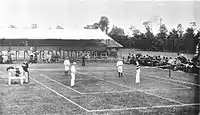 ![]() Clarence Clark med sin bror Joseph Sill Clark, Sr. (bag nettet) under doublekamp i Wimbledon i 1882 mod brødrene William og Ernest Renshaw | |