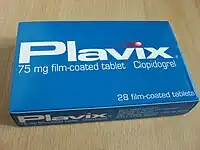 En pakning med 75 mg clopidogrel tabletter.