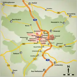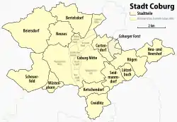 Coburg er inddelt i 13 bydele og landsbyer. Areal og indbyggertal er fra år 2002.
