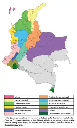 Det colombianske territorium rummer 1025 forskellige traditionelle rytmer.[12] Af gode grunde kan ikke alle rytmerne præsenteres her, men de følgende underafsnit præsenterer en række rytmer, der er repræsentative for hver region.[13] Du kan høre, hvordan de forskellige rytmer lyder ved at trykke på musiknoderne: