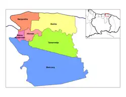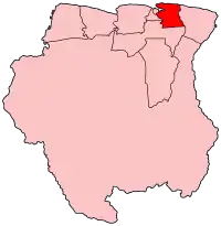 Kort over Surinam. Commewijne-distriktet er fremhævet med rødt.