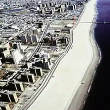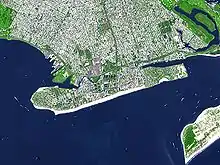Luftfoto af Coney Island, placeret i midten til venstre, taget af NASA. Halvøen til højre er Rockaway.