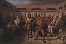 Motivet i Ægirs gæstebud er en scene fra den nordiske mytologi, hvor Loke jages væk af Thor, efter at han har opført sig hånligt over for guderne til en fest hos havjætten Ægir. I denne historie fremstilles Thor som helten, der jager skurken Loke væk. Da maleriet stod færdigt, modtog Hansen kritik for ikke at være lykkedes med opgaven. Samtidens kritikere mente, at guderne var fremstillet for milde og at de derfor ikke fremstod guddommelige nok.[17]