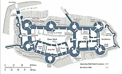 Porten ledte til den ydre borggård med forskellige administrative bygninger, som depotrum, værksteder og stalde.[41] Der var adgang til det nordvestlige tårn via portnerens bygning og her var begrænset beboelse og opmagasinering.[42] Det sydvestlige tårn er enten brugt af borgens konstabler eller af garnisonen. Her lå også et bageri.[42] På sydsiden af borggården var en række bygninger som storsalen og kapellet, som lå oven på kældrene, som ses i dag.[43] Fundamenterne og en enkelt stenbue fra 1340'erne kan stadig ses.[44] Bag storsalen var en fangetårn. Her lå "dettors chambre" ("debitors kammer") i 1500-tallet og en kælder.[45] På nordsiden af borggården lå køkken, bryggeri og bageri, der lå bag køkkentårn med beboelse og depotrum.[46]