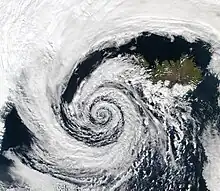 Corioliseffekten er årsagen, der får vinde og havstrømme til i grove træk at rotere mod uret omkring lavtryk og med uret omkring højtryk på den nordlige halvkugle. På den sydlige halvkugle er det lige omvendt, men hvis man forestiller sig, at man stod på Nordpolen og kunne kigge på den sydlige halvkugle gennem Jorden, opfører højtryk og lavtryk sig på samme måde på begge halvkugler. I dette tilfælde er Jorden det roterende koordinatsystem. Set fra nordpolen drejer Jorden mod uret og det får vinde og havstrømme til at skyde mod højre på vej mod et lavtryk og derfor nærme sig lavtrykket i en spiral mod uret.