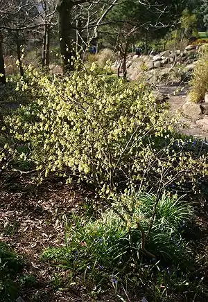 Blomstringen sker før løvspring i april. Blomsterne er samlet i hængende klaser, og de enkelte blomster er lysegule med røde støvdragere. Frugterne er brune kapsler, men frøene modner ikke i Danmark.