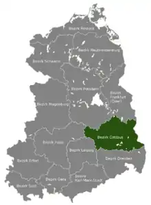 Bezirket Cottbus blev oprettet i 1952 efter opløsningen af delstaterne i DDR som en af i alt 14 bezirke. Den sydlige del af delstaten Brandenburg og en del af delstaten Sachsen-Anhalt med kredsene Jessen, Herzberg og Bad Liebenwerda blev indlemmet i bezirken Cottbus.
