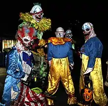 En gruppe mennesker iklædt klovnekostumer inspirert af skrækfilm.