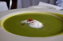 Aspargessuppe med cremefraiche og røde peberkorn.
