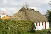 Et af de ældre huse i Døstrup med kirken i baggrunden