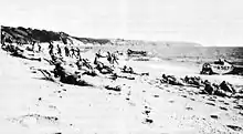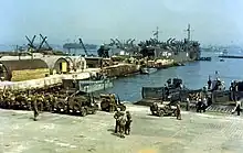 ![]() Landsætning i en af de første angrebsbølger på Omaha Beach om morgenen 6. juni 1944. |