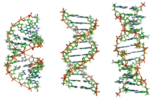DNA eksisterer i mange mulige konformere, der inkluderer A-DNA, B-DNA og Z-DNA, selvom kun B-DNA og Z-DNA er blevet direkte observeret i funktionelle organismer.[14] Den konformer som DNA indtager afhænger af hydratiseringsniveauet, DNA-sekvensen, mængden og retningen af supercoiling, kemiske modifikationer af baserne, typen og koncentrationen af metalioner, såvel som tilstedeværelsen af polyaminer i opløsningen.[45]