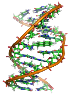 DNA er en lang polymer lavet af gentagende enheder kaldet nukleotider.[5][6] DNA's struktur er ikke-statisk,[7] alle arter består af to heliske kæder, der hver snor sig om den samme akse, og hver med en bane på 34 ångström (3,4 nanometer) og en radius på 10 ångström (1,0 nanometer).[8] Ifølge et andet studium kan DNA-kæden, i en bestemt opløsning, måles til at være 22 til 26 ångström bred (2,2 til 2,6 nanometer), og en nukleotidenhed blev målt til at være 3,3 Å (0,33 nm) lang.[9] Selvom hver individuel gentagende enhed er meget lille, kan DNA-polymerer være meget store molekyler indeholdende millioner af nukleotider. For eksempel består DNA'en i det største menneskekromosom, kromosom nummer 1, af omkring 220 millioner basepar[10] og ville være 85 mm langt, hvis det blev rettet ud.