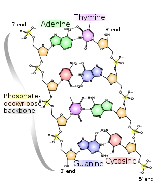 De fleste DNA-molekyler består af to biopolymer-strenge snoet omkring hinanden i en dobbelthelix. De to DNA-strenge er kendt som polynukleotider, siden de består af simplere enheder kaldet nukleotider. Hvert nukleotid består af en nitrogenholdig nukleobase — enten cytosin (C), guanin (G), adenin (A) eller thymin (T) — såvel som en sukker kaldet deoxyribose og en fosfatgruppe. Nukleotiderne forbindes med hinanden i en kæde af kovalente bindinger mellem sukker fra det ene nukleotid og fosfat fra det andet, hvilket resulterer i en alternerende sukker-fosfat-rygrad.[1][2]