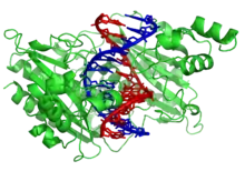 Polymeraser er enzymer, der syntetiserer polynukleotidekæder fra nukleosidtrifosfater. Deres produkters sekvens skabes på basis af eksisterende polynukleotidkæder – kaldet "skabeloner". Disse enzymer fungerer ved at føje et nukleotid til 3′-hydroxylgruppen i enden af den voksende polynukleotidkæde gentagne gange. Som konsekvens heraf arbejder alle polymeraser i en 5′- til 3′-retning.[123] I disse enzymers aktive sæde baseparres den nye nukleosidtrifosfat til skabelonen: Dette lader polymeraser syntetisere deres skabelons komplementære streng på korrekt vis. Polymeraser klassificeres efter den type skabelon, som de anvender.