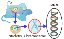 Inde i celler organiseres DNA i lange strukturer kaldet kromosomer. Under celledeling duplikeres disse kromosomer ved en proces kaldet DNA-replikation, hvilket giver hver celle sit eget komplette sæt af kromosomer. Eukaryote organismer (dyr, planter, svampe og protister) opbevarer det meste af deres DNA i cellekernen og noget af deres DNA i organeller, såsom mitokondrier eller grønkorn.[4] I modsætning hertil opbevarer prokaryoter (bakterier og arkæer) kun deres DNA i cytoplasmaet. Inde i kromosomerne komprimeres og organiseres DNA'en af kromatinproteiner såsom histon. Disse kompakte strukturer guider interaktionerne mellem DNA og andre proteiner, og hjælper med at kontrollere, hvilke dele af DNA'en der transskriberes.