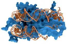 I modsætning hertil er der andre proteiner, som har udviklet sig til at binde til bestemte DNA-sekvenser. De mest intensivt studerede af disse er de forskellige transskriptionsfaktorer, som er proteiner, der regulerer transskription. Hver transskriptionsfaktor binder til et bestemt sæt af DNA-sekvenser og aktiverer eller hæmmer transskriptionen af gener, som har disse sekvenser tæt på deres promotere. Transskriptionsfaktorerne gør dette på to måder. For det første kan de binde RNA-polymerasen ansvarlig for transskription, enten direkte eller gennem andre mediatorproteiner; dette lokaliserer polymerasen ved promoteren og lader den begynde transskription.[115] Alternativt kan transskriptionsfaktorer binde enzymer, som modificerer histonerne ved promoteren. Dette ændrer på DNA-skabelonens tilgængelighed for polymerasen.[116]