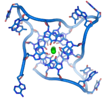 Disse guaninrige sekvenser kan stabilisere kromosomender ved at danne strukturer af stablede sæt af fire-baseenheder, snarere end de normale basepar i andre DNA-molekyler. Her danner fire guaninbaser en flad tallerken, og disse flade firebaseenheder stables derefter ovenpå hinanden for at danne en stabil G-quadruplexstruktur.[65] Disse strukturer stabiliseres af hydrogenbindinger mellem basekanterne og chelat fra en metalion i midten af hver firebase-enhed.[66] Der kan også dannes andre strukturer, hvor det centrale sæt af fire baser kommer fra enten en enkelt streng foldet omkring baserne, eller flere forskellige parallelle strenge, der hver bidrager med en base til den centrale struktur.