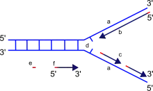 a: originalstrenge, der fungerer som skabeloner b: leading strand, c: lagging strand, d: replication fork, e: primer, f: Okazaki-fragmenter. Størrelsesforholdene på billedet er ikke korrekte. Okazaki-fragmenter spænder fra ca. 100-2000 basepar i længde.