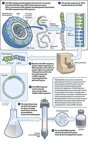 DNA-vacciner overfører − transfekterer[note 1] − ligesom mRNA-vacciner en specifik antigen-kodende nukleotid-sekvens, i disse tilfælde en DNA-sekvens ind i værtsorganismens celler.[15][16]