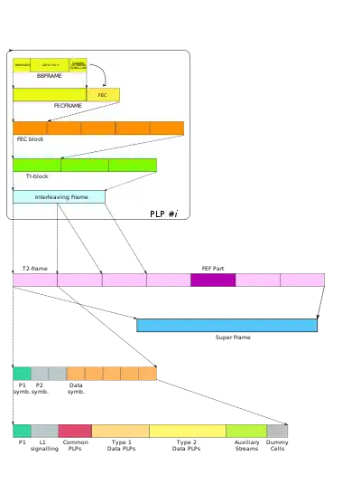 | Fejlkorrektion | Faltningskodning (Viterbi) + Reed–Solomon fejlretning 1/2, 2/3, 3/4, 5/6, 7/8 | LDPC + BCH 1/2, 3/5, 2/3, 3/4, 4/5, 5/6 |