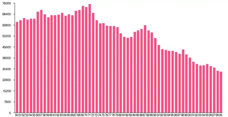 | Utviklingen i Arbeiderbladets / Dagsavisens oplag 1950 – 2009. |