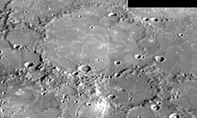 Skrå vinkel af Dali-krateret på Merkur. Mosaik lavet af MESSENGER-kamerafotos. Nord er cirka i toppen, den 14. januar 2008. Ved Planetary Image Locator Tool, USGS Astrogeology Science Center.