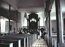 Kirken er gulkalket med en løgkuppel øverst mod vest. Den har en smal fløjdør og et kort våbenhus. Det indre af kirken domineres af søjler og et stort alterparti med prædikestol højt hævet over altertavlen. Alt er bygget i træ og i dæmpede grå toner.