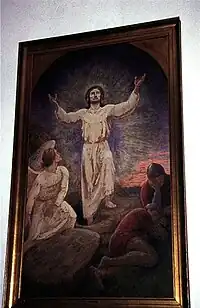 På sydvæggen ses et portræt af den første præst, Rasmus Platou, og et opstandelsesbillede af Niels Skovgaard.