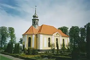 På hver sin side af den lille småstensbelagte parkeringsplads foran kirken står gulkalkede huse: til venstre en kirkelade fra 1700-tallet, til højre en noget yngre bygning.