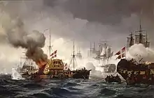 Uden en formel krigserklæring landsatte englænderne 16. august 1807 en større styrke på Sjælland ved Vedbæk. Da den danske hovedstyrke befandt sig i Holsten sammen med kongen og kronprinsen, måtte den nyudnævnte kommandant Ernst Peymann kæmpe med overvejende utrænede landeværnssoldater.[53] Efter en engelsk belejring af København kom det til kampe syd for hovedstaden. Således blev en større dansk landeværnshær slået i slaget ved Køge 29. august.[54] Da ethvert forsøg på at slå de engelske landstyrker mislykkedes, og da flåden stadig var oplagt for ikke at udfordre englænderne, gjorde danskerne sig klar til et engelsk stormangreb. Det kom aldrig, men i stedet blev København i nætterne mellem 2. og 6. september offer for en bombning af civilbefolkningen. 1600 indbyggere blev dræbt og lige så mange såret. Efter den sidste nats bombardementer opgav Peymann og overgav betingelsesløst byen til englænderne, noget han senere blev dømt til døden for. Englænderne overtog nu alle de danske skibe, der lod sig klargøre, mens de ødelagde resten og alt værktøj og andre ting af værdi på Holmen. Et tilbud om en engelsk-dansk alliance blev afvist, da Frankrig allerede havde stillet ultimatum fra Frankrig: valget mellem enten at tilslutte sig Kontinentalspærringen eller belave sig på krig. Det engelske overfald på Sjælland skubbede Danmark i armene på Napoleon, der 31. oktober samme år kunne underskrive en fransk-dansk alliance i Fontainebleau. Danmark var nu officielt i krig med England, og alle danske kolonier blev herefter besat.[55]