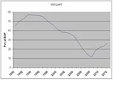 Udviklingen i Danmarks statsgæld siden 1990 ses i figuren til højre. Fra et højdepunkt på 57 % af BNP i 1993 faldt gældskvoten uafbrudt i de næste 15 år til at udgøre 11 % i 2008, hjulpet på vej af højkonjunkturerne i 1990'erne og 2005-08. I 2009 fik Danmark et betydeligt underskud på statsfinanserne som følge af finanskrisen, og dermed begyndte statsgælden igen at stige. I 2012 udgjorde den 487 mia. kr. eller 26,7 % af BNP.[3] Siden har gælden vokset langsommere end bnp-udviklingen, så den ved slutningen af 2020 udgjorde 536 mia. kr. svarende til 23 % af BNP.[1][4]