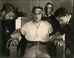 ![]() John Bach ved at blive spændt fast i den elektriske stol | |