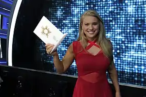 ![]() Anja Nissen efter hun vandt Dansk Melodi Grand Prix 2017. | |
