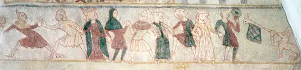 En af de vigtigste verdslige genrer i middelalderen var balladen. Det var en sunget fortælling, undertiden danset og undertiden ledsaget af musik, der primært handlede om kamp og kærlighed i et riddermiljø.[70] I dag Danmark er disse sange siden begyndelsen af 19. århundrede blevet kaldt folkeviser, men de er en del af en fælleseuropæisk balladetradition.[71] Den nordiske balladeform opstod i 13. århundrede, og havde rødder i både traditionel nordisk og fransk poesi. Derimod kan tysk indflydelse først spores fra 14. og 15- århundrede.[72] I Danmark er der bevaret over 500 ballader, hvilket er usædvanligt mange, også i sammenligning med det øvrige Europa.