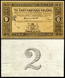 I 1788 begyndte danskerne at trykke egne pengesedler på øerne, med værdierne 20, 50 og 100 danske vestindiske rigsdalere. I 1806 tilføjede man 5 og 10 rigsdaler pengesedlerne, og fjernede 20 rigsdaler pengesedlen.