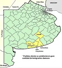 Danskerne i Provincia de Buenos Aires , koncentrerede sig overvejende i et område på ca. 45.000 km² i den sydlige del, centreret omkring de fire partidos (amter) Tandil, Necochea, Tres Arroyos og vest herfor Coronel Dorrego. Kun Tandil ligger inde i landet et stykke væk fra kysten. I dette relativt overskuelige område, der er på størrelse med Danmark, boede ca. 60 % af alle danske indvandrere i 1902. De fleste af de tusindvis af danskere, som fulgte i de følgende årtier, rejste også til denne zone. Det skyldtes især det personlige netværk, der gav de nyankomne arbejde og et fællesskab omkring andre ting, herunder kirke og socialt samvær. Udgangspunktet for den danske indvandring i provinsen var byen Tandil. I de sidste årtier af 1800-tallet var det imidlertid områderne mellem Tandil og Atlanterhavskysten øst og syd på, der tiltrak danske indvandrere. Det var især jernbanens udvidelse og billige jordudstykninger, som skabte denne udvikling.