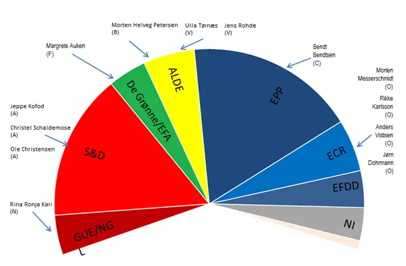 De 13 danske europaparlamentarikere er fordelt på seks forskellige politiske grupper i Europa-Parlamentet. Rina Ronja Kari fra Folkebevægelsen mod EU sidder i Den Europæiske Venstrefløjs Fællesgruppe/Nordisk Grønne Venstre. Jeppe Kofod (S), Ole Christensen (S) og Christel Schaldemose (S) sidder i den socialdemokratiske S&D-gruppe mens Margrete Auken (SF) sidder i De Grønnes gruppe. Morten Helveg Petersen (RV) og Jens Rohde (RV) sidder sammen med Morten Løkkegaard (V) i den liberale ALDE-gruppe. Bendt Bendtsen (K) sidder i den konservative og kristendemokratiske EPP-gruppe, og Morten Messerschmidt (DF), Rikke Karlsson (DF), Anders Vistisen (DF) og Jørn Dohrmann (DF) sidder i ECR-gruppen.