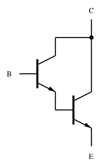 Kredsløbsdiagram af en Darlingtonkobling bestående af 2 NPN bipolare transistorer.