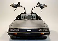 En DeLorean DMC-12 forfra med åbne mågevinger.