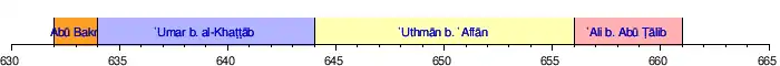 - Bemærk at tidslinjen er en indikator på årsbasis og ikke nødvendigvis identisk med at deres respektive kalifembeder faldt i begyndelsen af hvert år.
