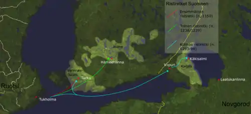 I 1150'erne skal ifølge overleveringen Erik den Hellige og biskop Henrik have ledet et korstog mod Finland (Republikken Novgorod, Gardarige). I dag betvivler man, at det fandt sted i form af et regelret korstog, da det savner belysning i samtidige kilder. Derimod er det troligt, at der på denne tid foretoges militære ekspeditioner fra svensk side, hvilke med tiden førte til, at Finland indlemmedes i det svenske rige.[1]