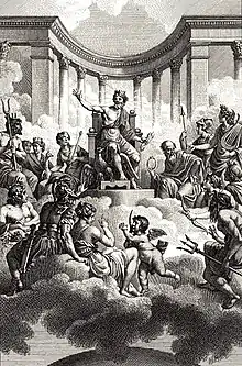 | Zeus | Jupiter | ![]() | Gudernes konge og hersker af Olympos; gud for himmelen og torden. Den yngste søn af titanerne Kronos og Rhea. Symboler var tordenkile, ørn, egetræ, scepter og vægtskål. Bror og ægtefælle til Hera, skønt han havde mange elskerinder. Bror til Poseidon og Hades. | Første |