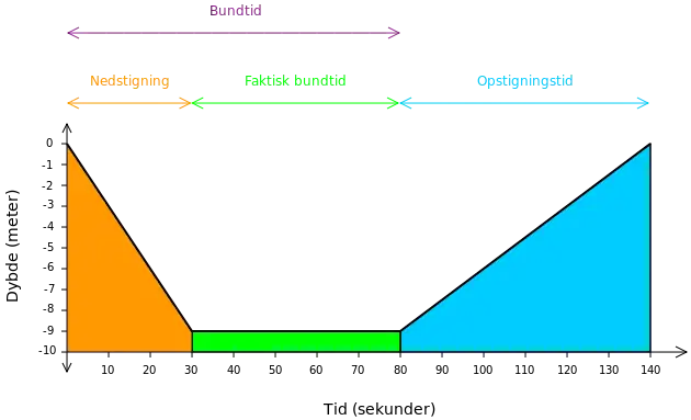 Ovenstående tegning illustrer et dyk, hvor dykkeren bruger 30 sekunder på at komme ned på maksimal dybden (9 meter), opholder sig 50 sekunder på denne dybde og til sidst bruger 60 sekunder på at komme op til overfladen.