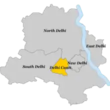 Kort over kommuner i NCT of Delhi, med Delhi Cantonment markeret.