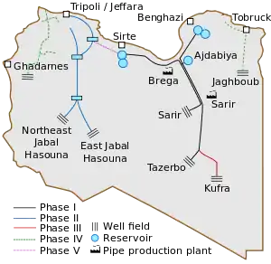 - BBC News: Libyens tørst efter 'fossilt vand' (artikel indeholder kort over rørnet)