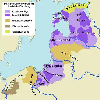 På det kirkelige plan blev hele ordensstaten først i 1255 organiseret i kirkeprovinsen Rīga, som omfattede otte bispedømmer, der alle var blevet grundlagt mellem 1186 og 1243: