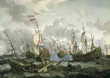I forgrunden Swiftsure der synker. Til højre den grundstødte Prince Royal med admiral Ayscue der overgiver sig ved at opsende hvid røg; de Ruyter på Zeven Provinciën accepterer.