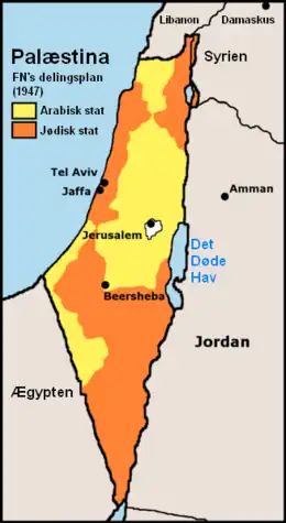 Den 29. november 1947 vedtog FN's generalforsamling FN's Generalsforsamlings Resolution 181 for at løse den arabisk-jødiske konflikt ved at dele Palæstina i to stater: en jødisk og en arabisk. Hver stat skulle bestå af tre hovedsektioner forbundet af ekstraterritorielle veje (ikke undergivet områdets administration); den arabiske stat skulle have en enklave ved Jaffa. Ifølge den kontroversielle israelske historiker Ilan Pappé, skulle jøderne, som udgjorde omkring 32% af den samlede befolkning, have 56% af territoriet. Området med Negev-ørkenen i syd rummede på det tidspunkt 499.000 jøder og 438.000 palæstinensere. Palæstinenserne skulle have 42% af landet, som dengang havde en befolkning på 818.000 palæstinensere og 10.000 jøder. I erkendelse af den religiøse betydning flere religioner tillagde Jerusalem-området med Betlehem, skulle det være Corpus Separatum under FNs administration.[21]