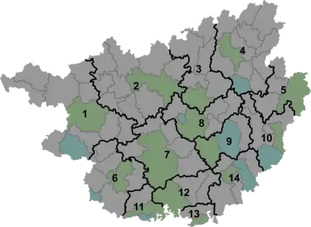 Guangxi er inddelt i 14 enheder på præfekturniveau, som alle er bypræfekturer.